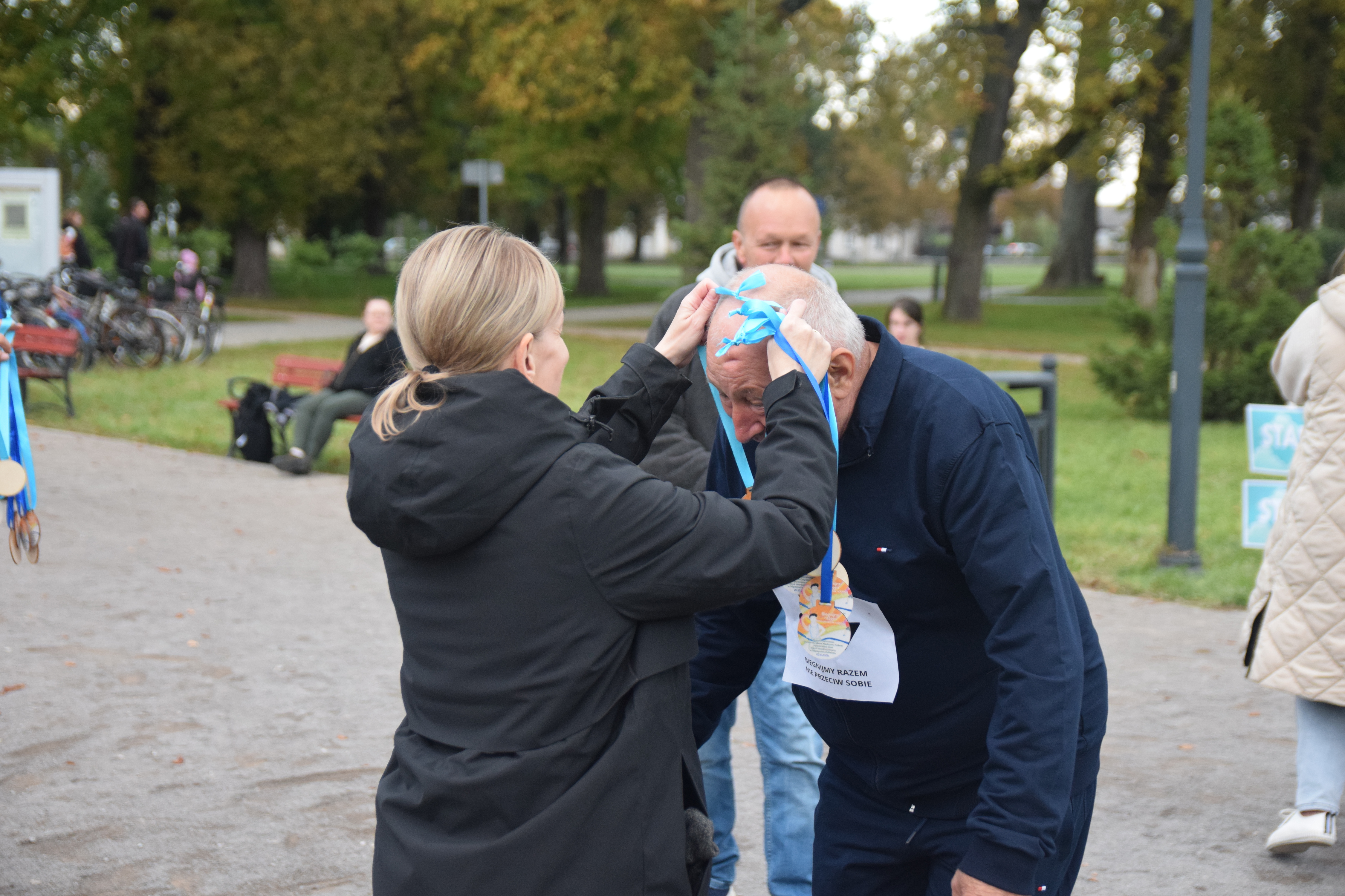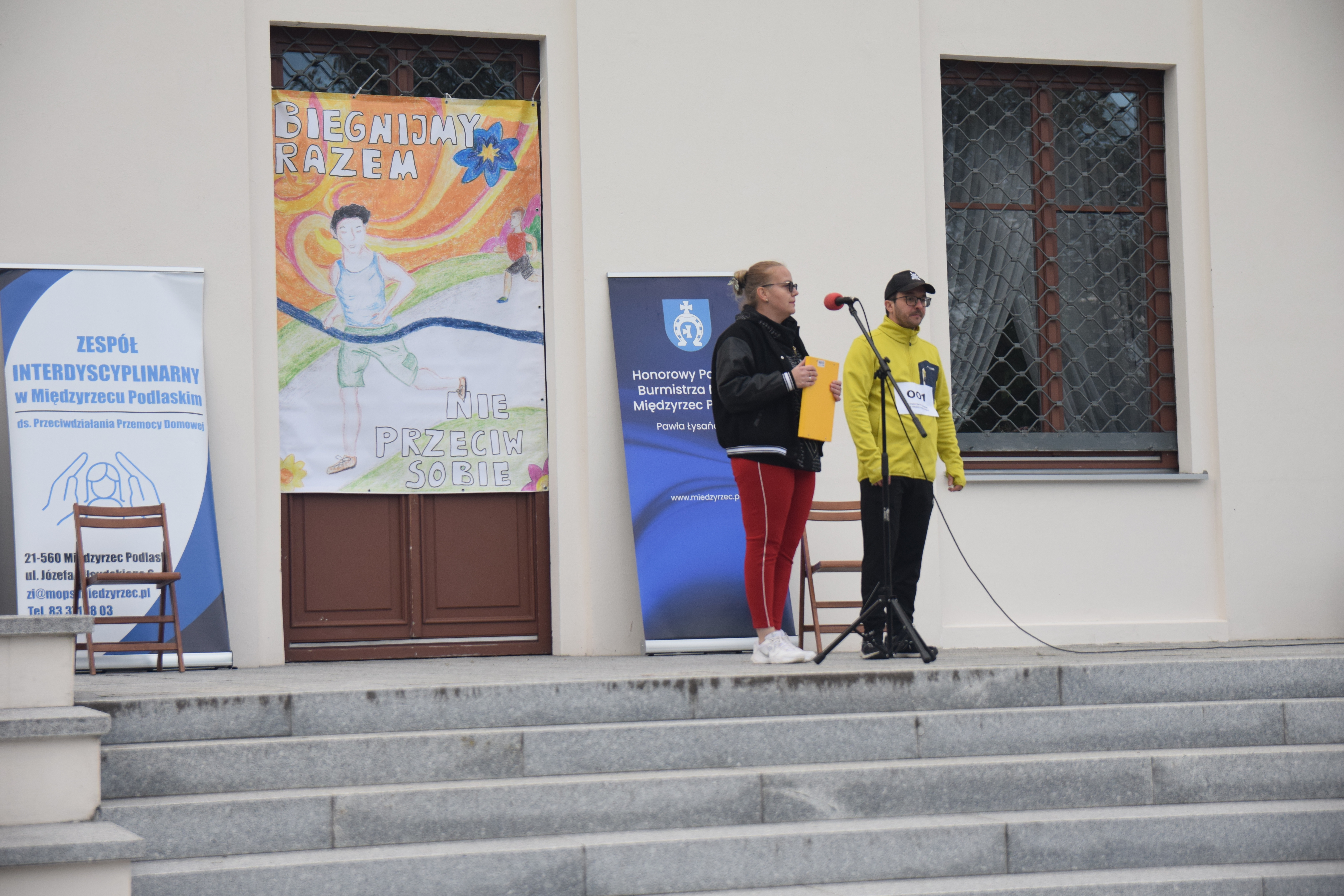 Uczestników biegu ciepło i serdecznie powitali Burmistrz Miasta Pan Paweł Łysańczuk i Przewodnicząca Zespołu Interdyscyplinarnego Pani Anita Sanecka, która w krótkiej informacji przybliżyła zebranym okoliczności inicjatywy zorganizowania biegu „Biegnijmy razem – nie przeciw sobie”. Burmistrz Miasta podziękował zebranym za uczestnictwo w wydarzeniu promującym prawo człowieka do godnego życia bez przemocy. Wyraził swoją dezaprobatę dla przemocy w każdym wymiarze, w każdej postaci i w każdej formie. Wskazał na ogromną potrzebę przeciwdziałania przemocy oraz konieczność reakcji w skali ogólnospołecznej na każdy przejaw przemocy. Podziękował uczestnikom za tak liczną manifestację w Międzynarodowym Dniu bez Przemocy iż w tym dniu jest wielu ludzi którym drogie są takie wartości jak życzliwość, tolerancja i wzajemna pomoc.